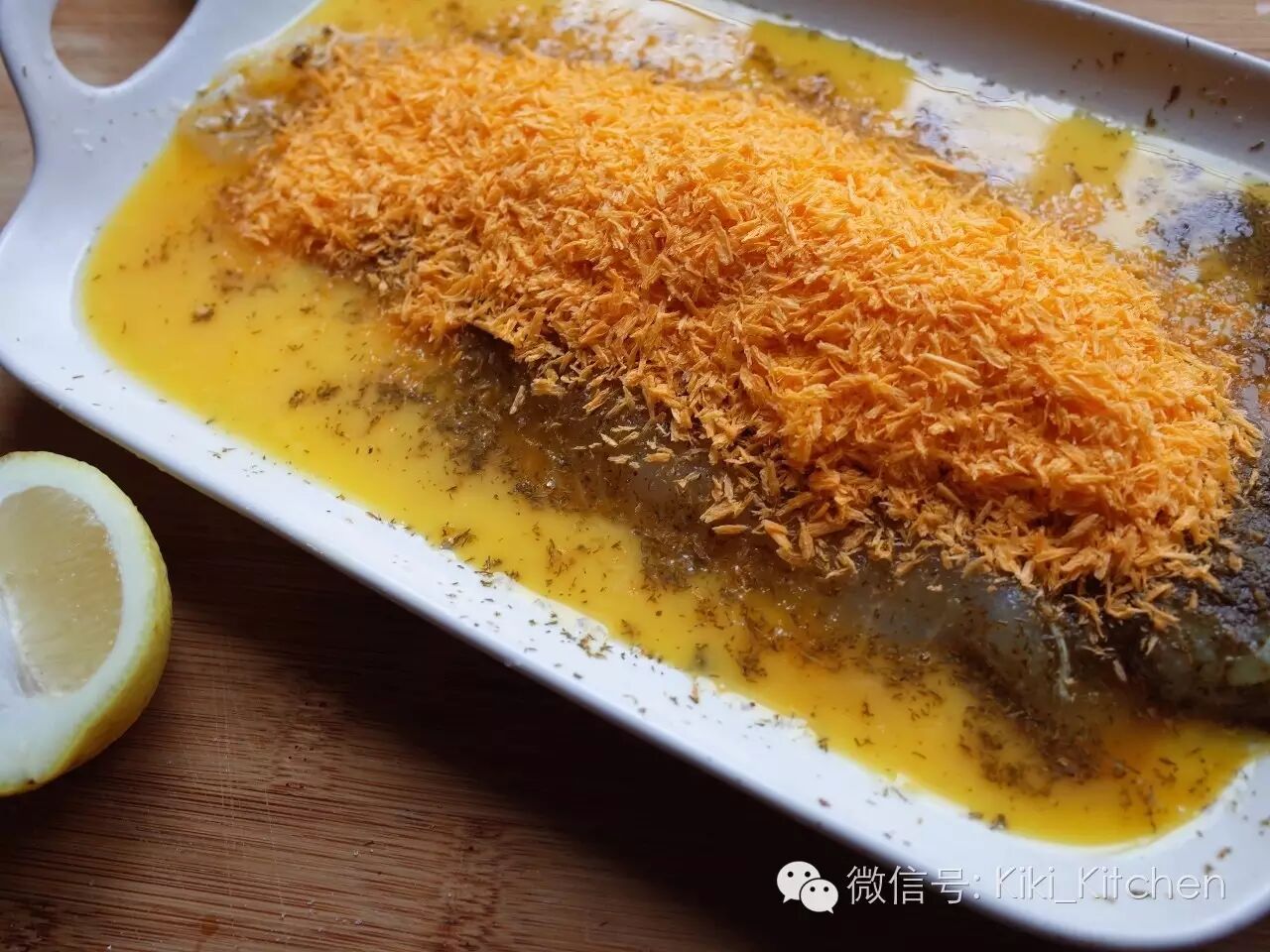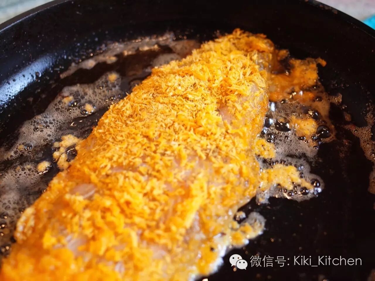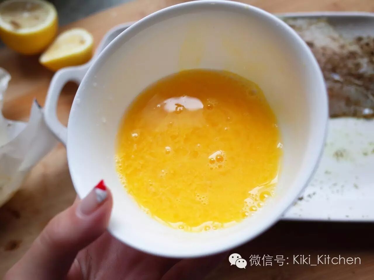 1/鸡蛋打散,包裹住用盐和干香草腌制的龙利鱼柳