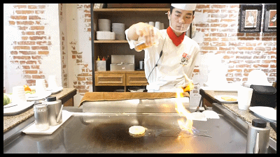 着火啦!“噌”地一下火苗蹿起半米(?)高!虽然铁板师傅提前通知了,但是小花还是有些被吓到了。眼看着可怜的菠萝圈在铁板上瞬间被点着了三次。