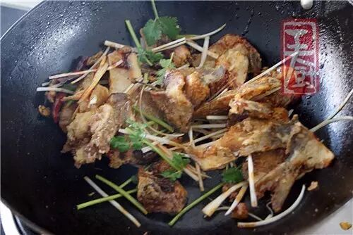 13、 淋入兑好的料汁,翻炒均匀,最后撒入香菜段和大葱丝,就可以了
