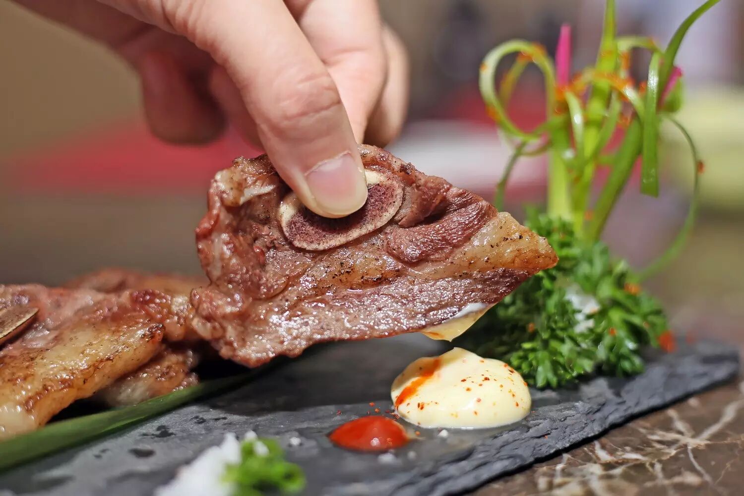 刚烤出来,热腾腾的!用手抓一块,有三种酱可以选择,小M选的是沙拉酱,清新的沙拉酱刚好综合了牛仔骨的油腻,吃起来有嚼劲,不油腻。