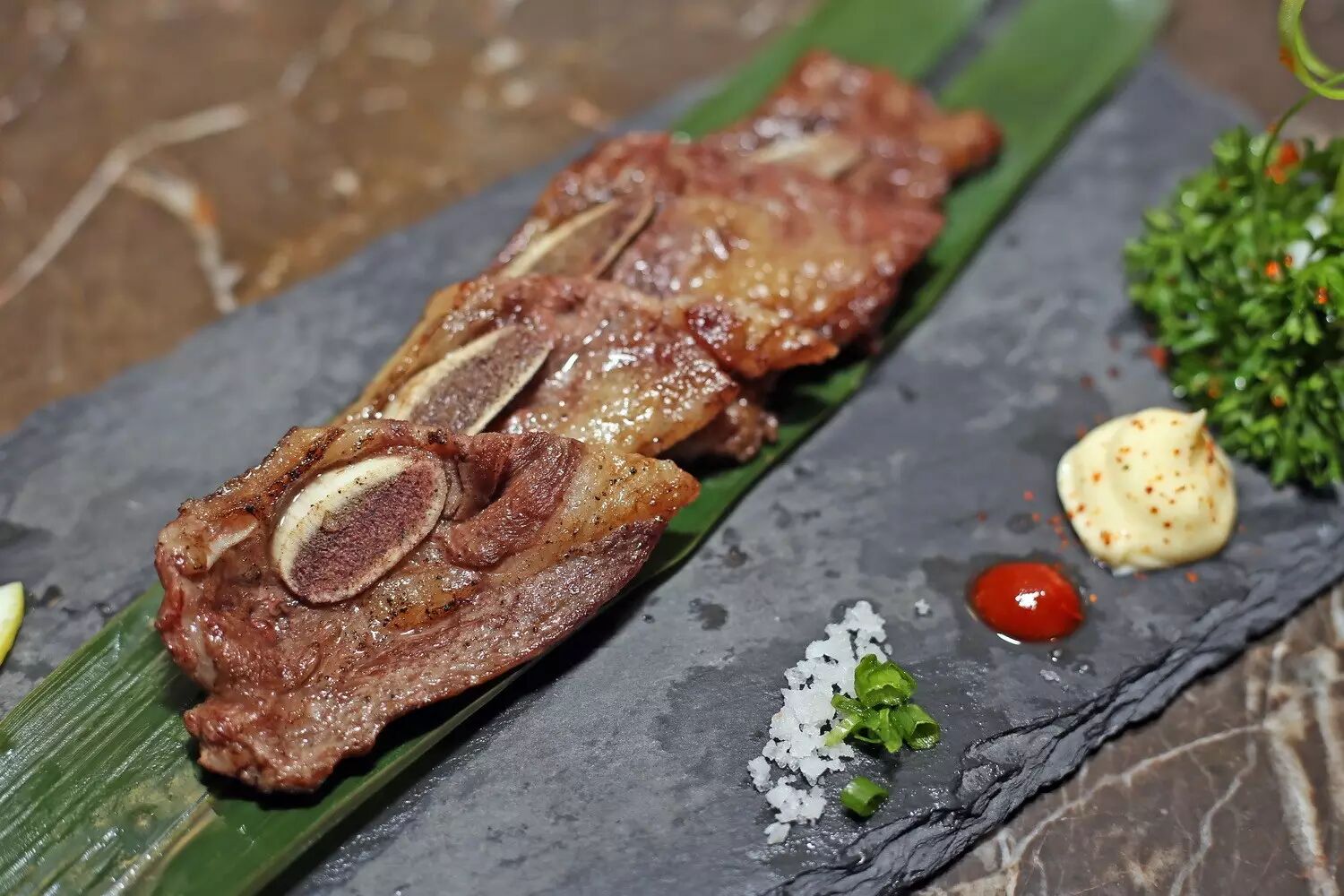 除了炉端烧海鱼外,还有炉端烧牛仔骨,筋肉分明,肥瘦相间。