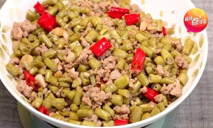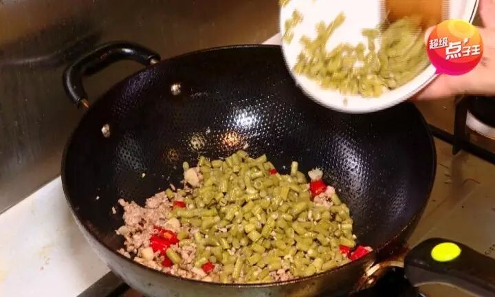 然后加入肉末,迅速炒散,肉末变金黄色后放刚刚炒好的酸豆角,中小火煸炒3分钟即可出锅。▽