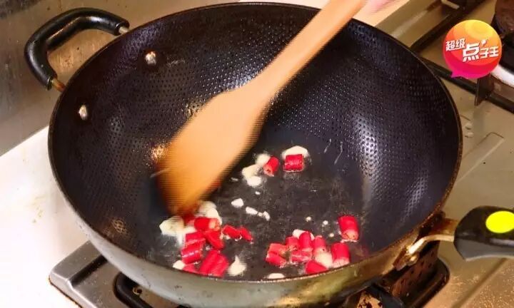 有了这自制的酸豆角,做酸豆角炒肉就很容易了~热锅热油,待油7成热的时候放入蒜米、辣椒爆香。▽