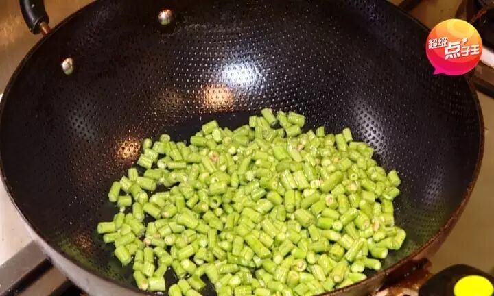 锅里放油,倒入豆角炒5分钟,把水分充分炒干。▽