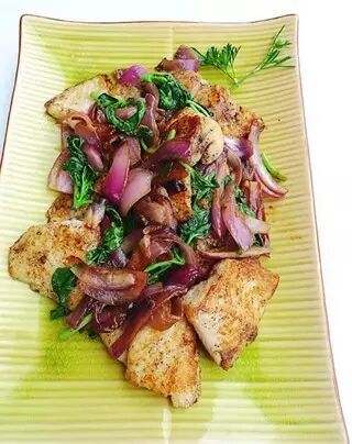 ● 鱼排装入洋葱上面滴入适量柠檬汁即可