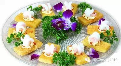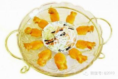 点评:咸蛋黄火局墨鱼仔与敲墨鱼丝相结合,有新意,有技术含量,成菜大气,出品喜庆,适应面广。要注意的是,敲墨鱼丝的配料要简洁、新鲜,不能太杂乱。