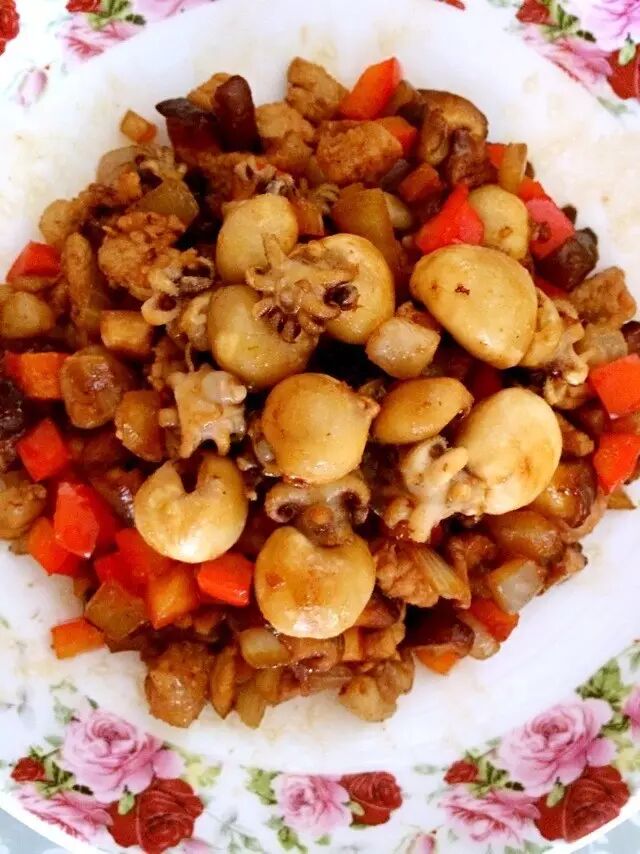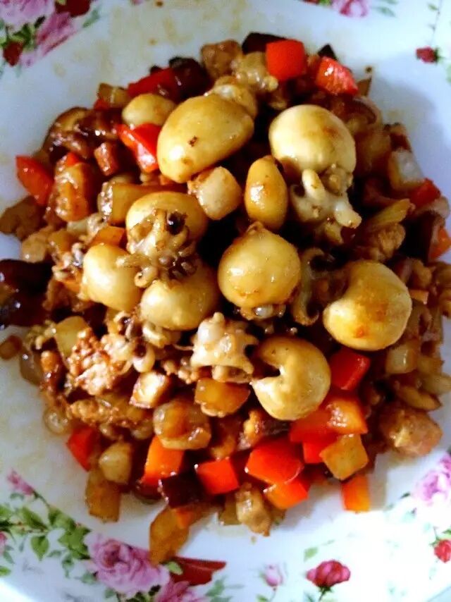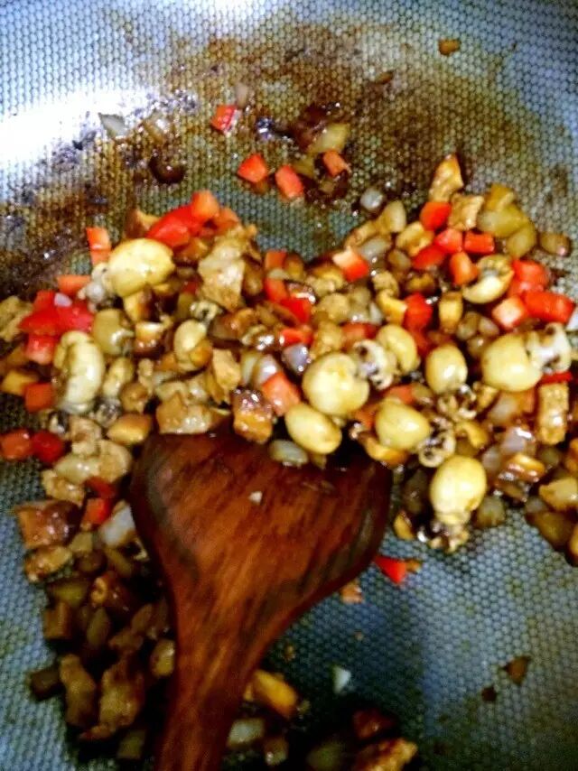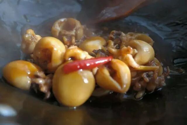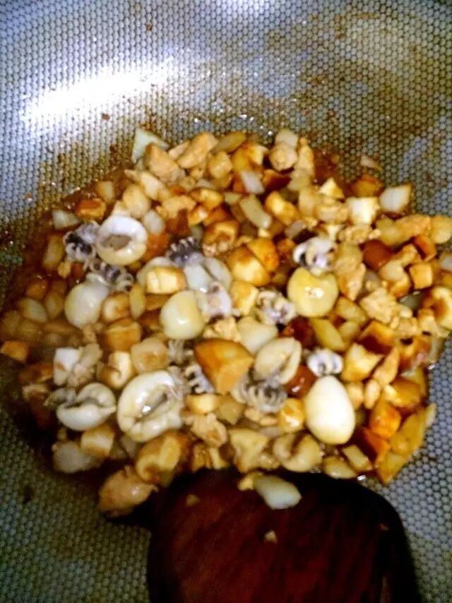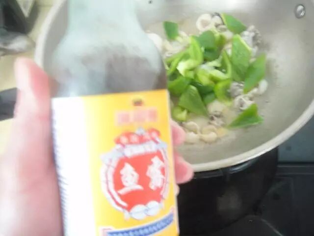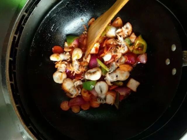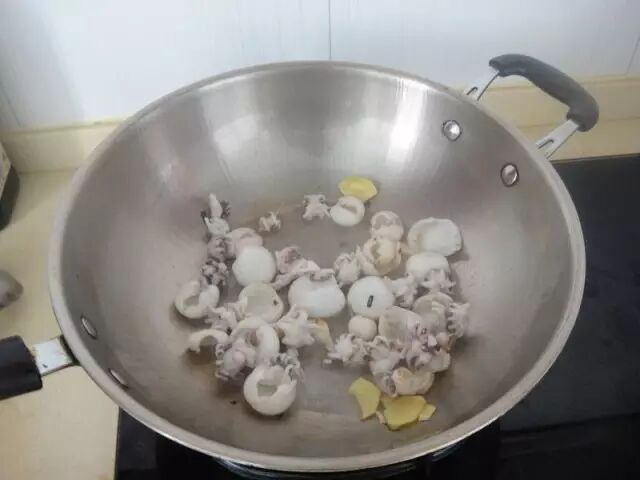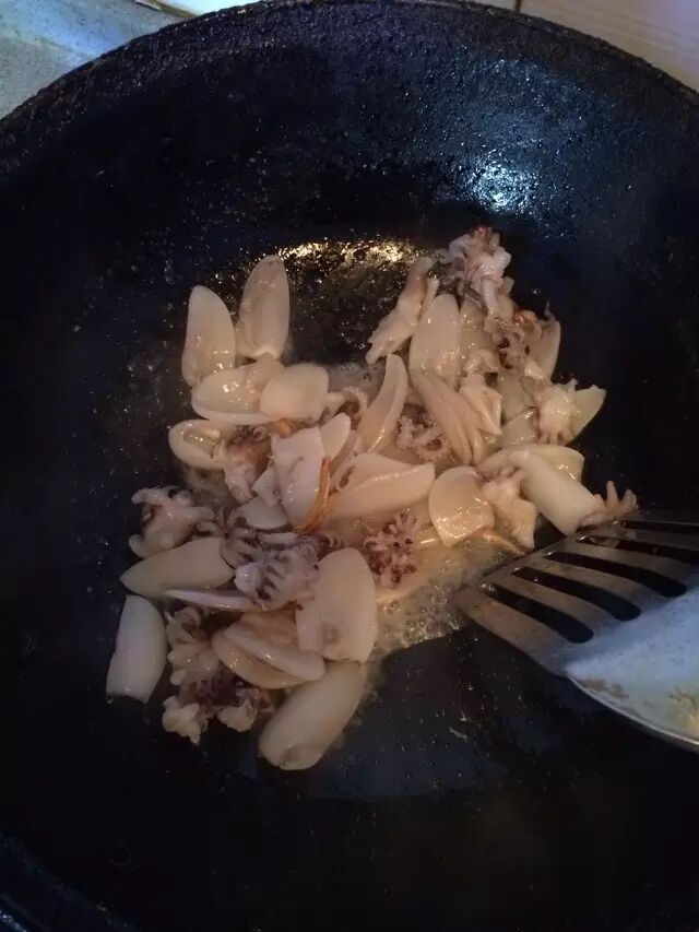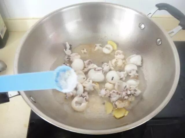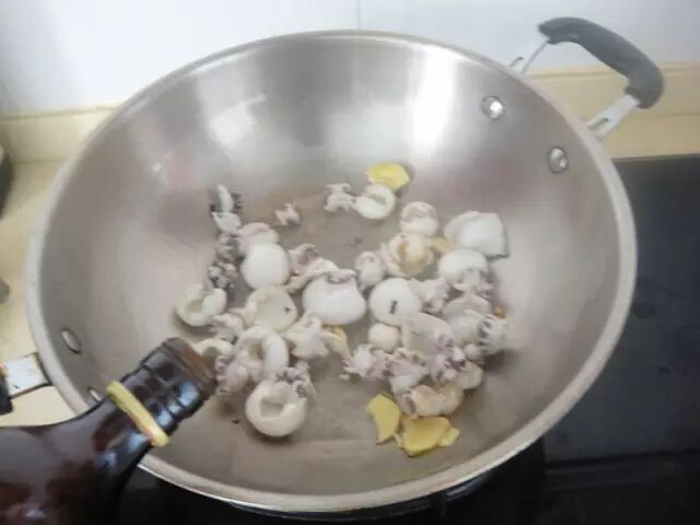 2. 墨鱼仔下锅翻炒1分钟左右后加两勺料酒。