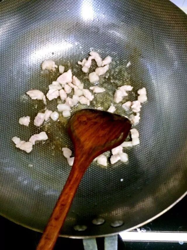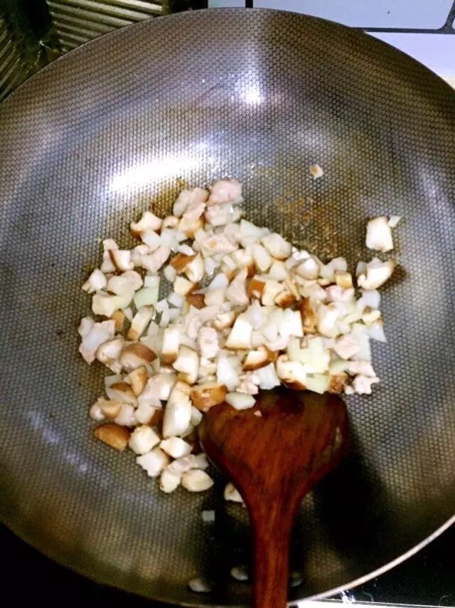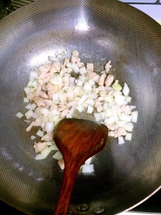 10. 待五花肉丁煸炒变色后 来个二次炝锅 放入洋葱丁 继续煸炒 炒出香味后