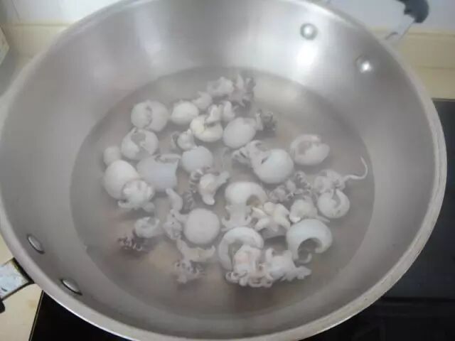 4. 锅内水开后倒入墨鱼仔烫一下就捞起