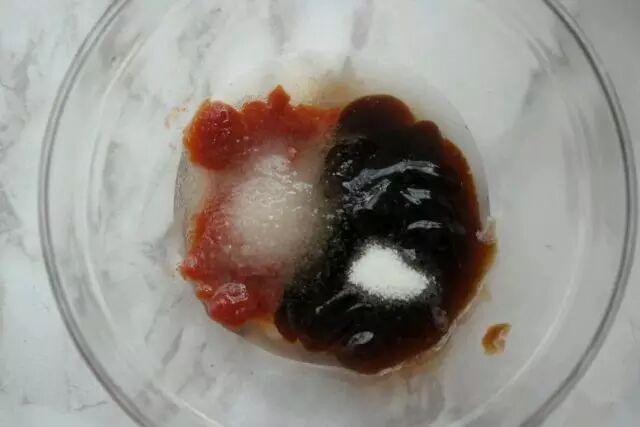 6. 取一个容器将米醋,蚝油,番茄酱,盐,糖混合