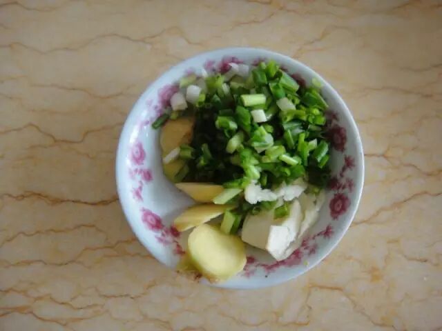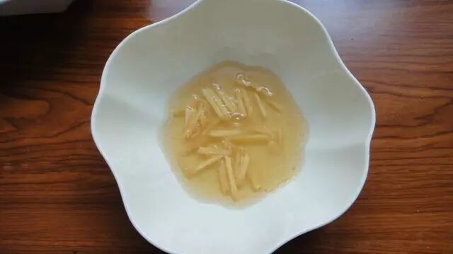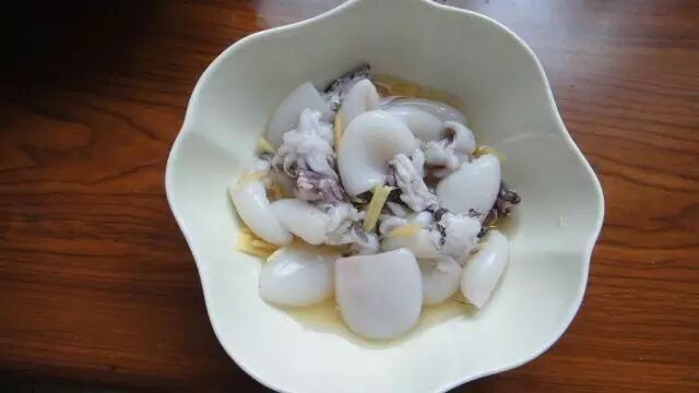 1. 碗里倒适量料酒,撒入姜丝。墨鱼仔洗净,要把眼睛和嘴都去掉,如果是买的冷冻的,已经去过内脏了,把肚子里的黑膜之类的也要去净。