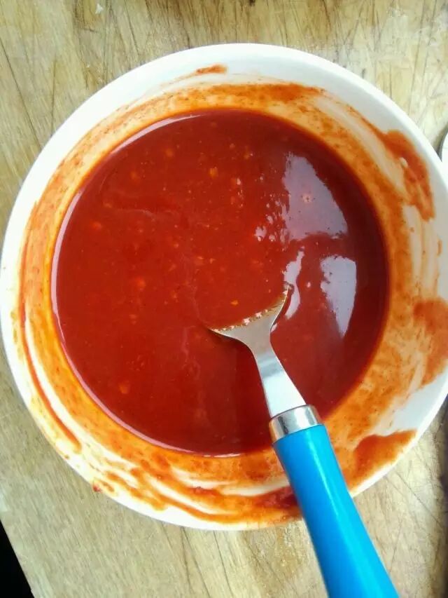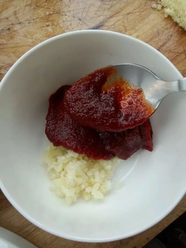 3. 调制酱汁。蒜切成蒜蓉,加入两大勺韩式辣椒酱。
