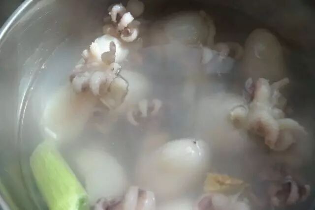 3. 为避免墨鱼在烹炒中出水,先加葱段和姜片煮水,水开放章鱼片汆一下