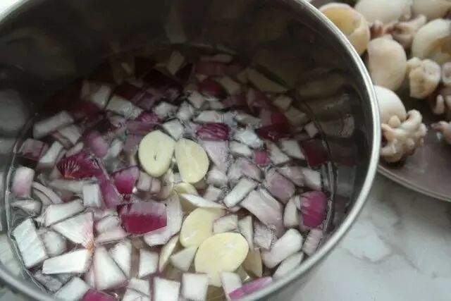 4. 墨鱼捞出控水备用。再取一锅加水150ml,水开后中火煮蒜瓣和洋葱粒(不盖盖子)