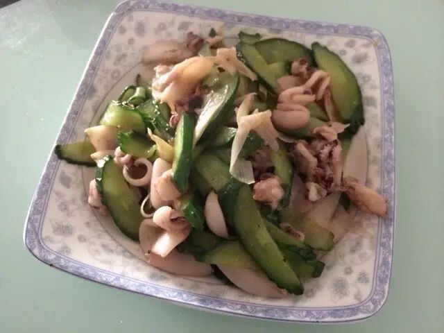 黄瓜和墨鱼仔的比例根据个人喜好来搭配。如果黄瓜比较小的话,可以两根。墨鱼仔里面有脏东西,一定要收拾干净。