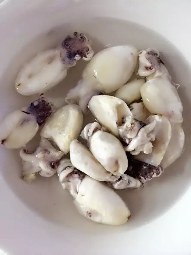1. 冷冻墨鱼仔泡水解冻,挤掉须中间的小黑点,然后用剪刀剪开眼睛,彻底清洗干净。加盐,料酒和姜片腌制15分钟。