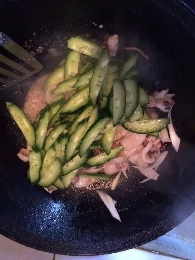 1. 黄瓜切片,墨鱼仔洗干净也切一下。生姜和葱切丝。油烧热后姜丝下锅炒,炒出香味。