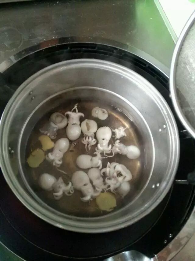 2. 锅里加入料酒,盐和姜片烧开水,下墨鱼仔焯水然后迅速捞出,基本上是一下进去搅一下就捞出来。