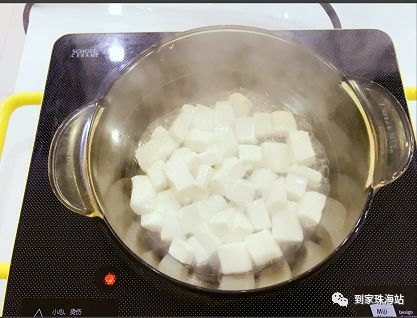 3.蒸南瓜的同时,将内酯豆腐划成小块,放在筛网中,放入沸水中焯水下,这一步也可以省略哈,有些宝宝不喜欢豆腐的生味儿,焯水下会更好些