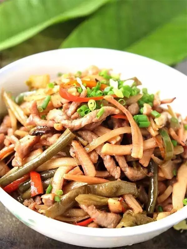在泡酸菜和泡豇豆下锅后,一定要炒至干香才加入墨鱼丝和猪肉丝,这样成菜后酸香风味才浓。