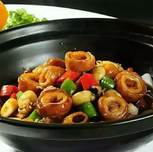 3、锅里放油烧热,投入姜丁、蒜丁煸至色黄时,加入青红辣椒圈续炒至出香,等到放肥肠节和墨鱼仔翻炒匀以后,再烹料酒并加盐、辣鲜露、蚝油、鸡精和胡椒粉调味。