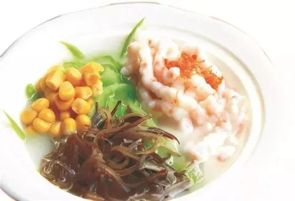 辅料:黑木耳丝30克,凉瓜片50克,甜粟米粒30克,干瑶柱丝10克。