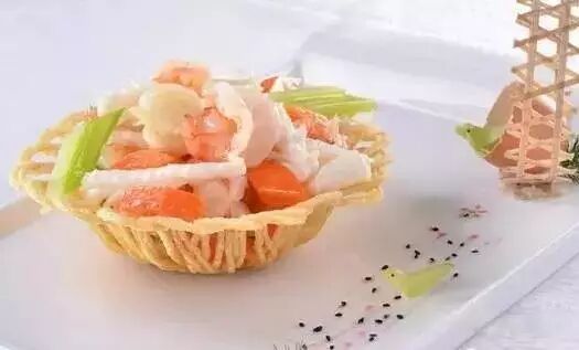 雀巢海中宝是一道广东的汉族传统名菜,属于粤菜系。此菜成菜后的形态较小,色泽粉白杏黄。清汁,虾仁鲜嫩腰果脆。
