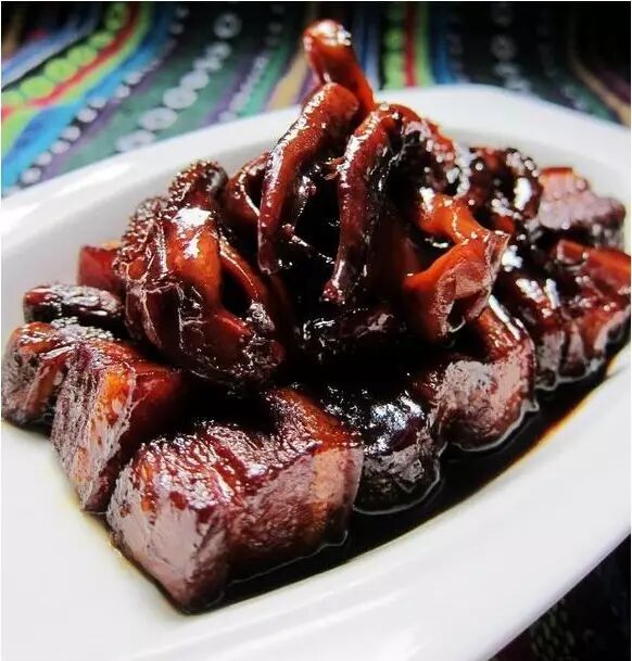用料: 墨鱼干泡发以后切半个、五花肉6两、冰糖50g、生姜3片、八角一个