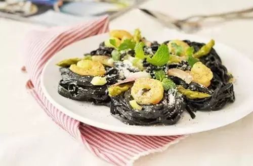 材料:墨鱼汁意面、虾仁、芦笋、洋葱、大蒜、橄榄油、高汤、淀粉、黄芥末、柠檬汁、黑胡椒粉、芝士粉、盐、新鲜薄荷叶。