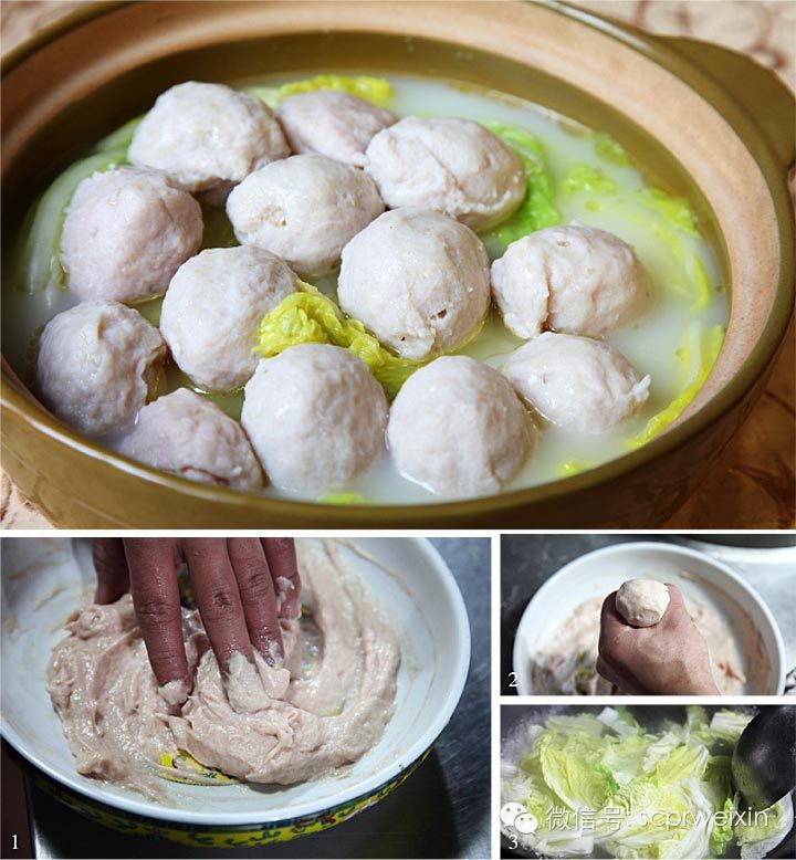 2.锅内加水烧开,然后端离火口,把肉馅做成丸子放入锅内,用小火保持水面沸而不腾煮约10分钟捞出。