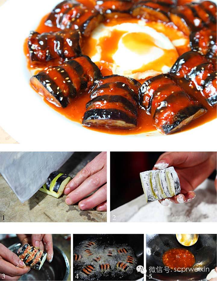 5.把茄子放入油锅内炸至皮酥且熟,捞出围于盘中煎蛋边上。
