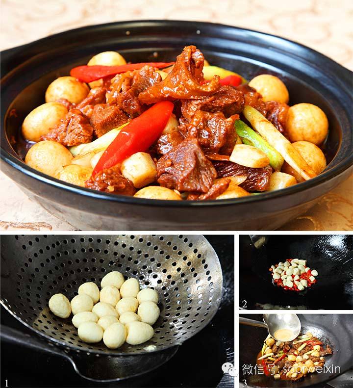 4.往锅内掺入鲜汤,放入牛腩和鹌鹑蛋,调入盐、味精、鸡精、蚝油、酱油和蒸鱼豉油,烧至入味时投放大葱节和红二荆条辣椒块,最后勾入少量红油,起锅装于小砂锅内便好。