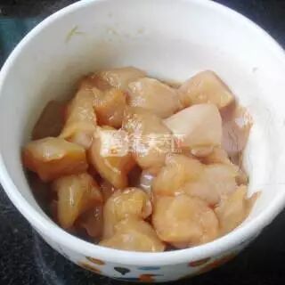 1、鸡肉切小块,加入酱油、料酒、淀粉和适量盐油拌匀腌制一会儿