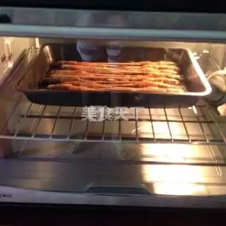 7、烤箱用烤肉功能预热200度上下火,把串放入烤20分钟
