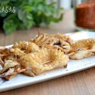 1.竹签在使用前用清水浸泡透,防止在烤箱遇高温燃烧。 2.墨鱼用竹签在两端串好,烤制时就不会卷起来。