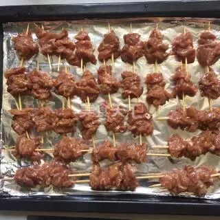 7、2个小时后取出肉,用竹签将肉肉串成一串串的。