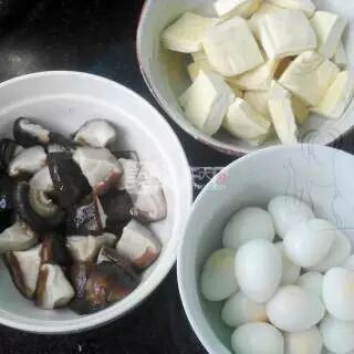 2、鹌鹑蛋煮熟去壳;香菇切块焯水;豆腐切块焯水
