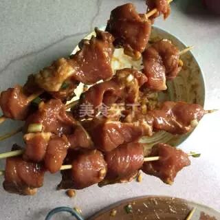 7、腌制好的肉用牙签串上,每根大约3~4块肉