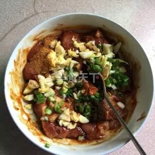 4、加入蚝油1茶匙,老抽1茶匙,生抽2茶匙,糖1茶匙,料酒2茶匙,五香粉半茶匙,辣椒粉半茶匙,白胡椒粉半茶匙,孜然粉半茶匙,盐1小勺,淀粉2茶匙,食用油3茶匙调拌均匀