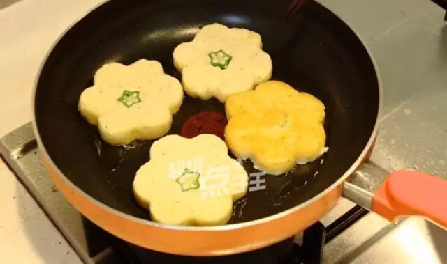 将土豆泥填入模具后压紧实,中间放一颗焯过水的秋葵。想多吃点秋葵可以多放几颗哦~土豆饼全都塑好型后就可以下锅煎了。▽