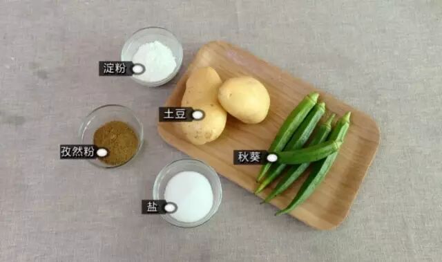 2个土豆、秋葵、淀粉、孜然粉、盐