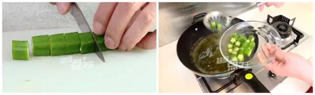 将秋葵切成2厘米的小段,放入沸水中稍微过一下,这样就能去除掉秋葵的粘液和腥臭味,吃起来更清爽。注意不要焯太久,熟透的话煎秋葵的香味就没有了。▽