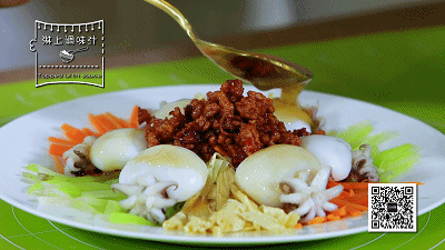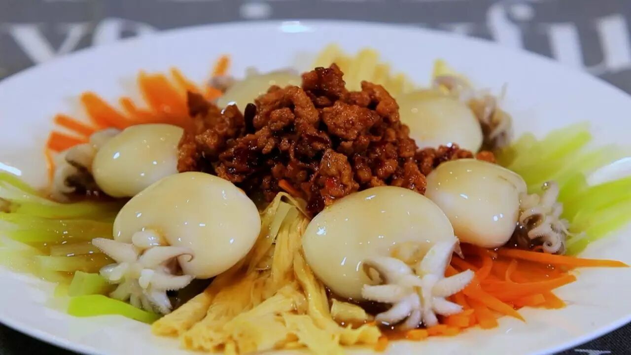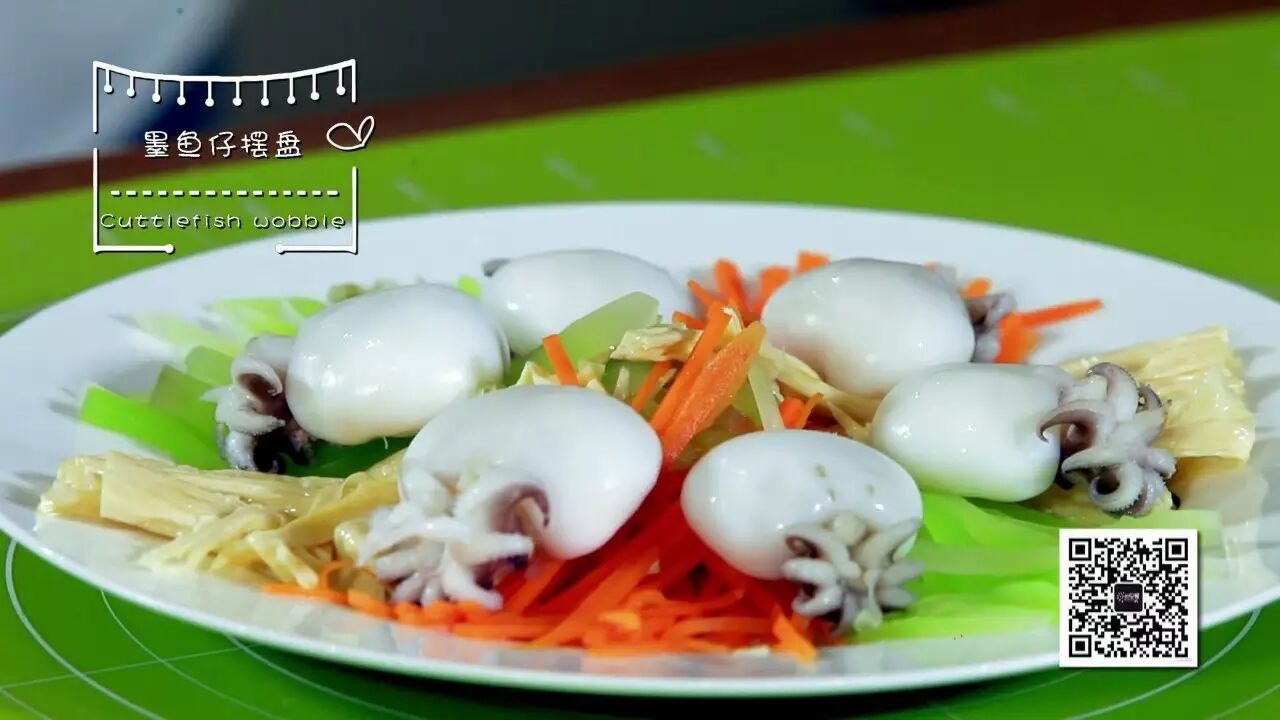 3. 蔬菜丝摆盘,码好墨鱼仔,中间放上肉沫;