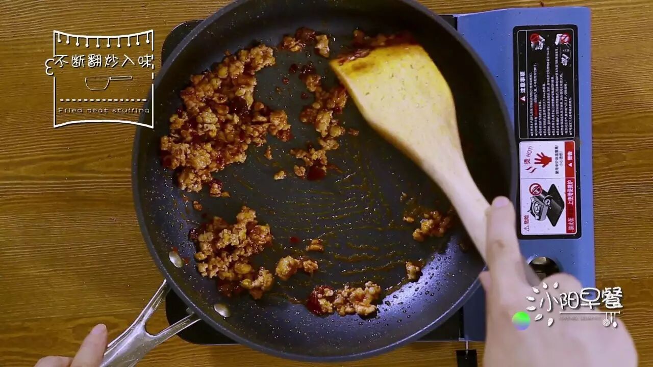 4. 油热后,放入姜、蒜、豆瓣酱、猪肉馅儿炒香;