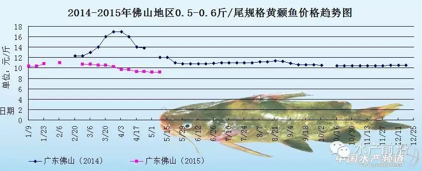 下图是2014年、2015年广东佛山地区0.5-0.6斤/尾规格黄颡鱼的价格趋势图,由图中可以看出3月份,年后黄颡鱼的市场销售进入消费淡季,鱼价不断下滑,鱼价与2014年同期相比相差了6-7元/斤,价格降幅非常明显。4月份自清明节过后,市场刚性需求偏淡,市场消费推动力不足,黄颡鱼的整体市场走量小,价格依旧处于低位,预计后市鱼价难涨。4月下旬,各地的天气都开始变热,黄颡鱼的市场消费量也因此不断缩减,现在各地地区的黄颡鱼存塘积压过多,广东鱼价不断下滑,短期内行情不被看好。五一假期过后,外省地区的养殖户为了投放苗种,都在清塘卖鱼,整体市场出现供大于求的现象,致使各地鱼价纷纷下滑。具体趋势如下: