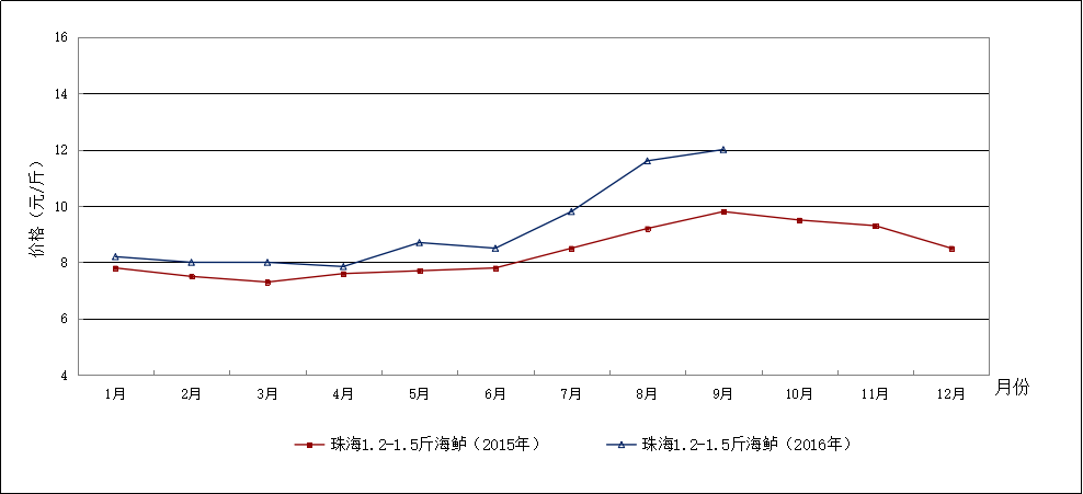 今年的海鲈价格总体表现不错,双节前海鲈水车和冰鲜价格稳定在较好价位,且1.5斤/尾以上大规格鱼价持续提升。截至9月15日,广东珠海斗门白蕉地区1.2-1.5斤/尾的海鲈水车价格是12元/斤,1.3-1.7斤/尾的海鲈冰鲜价格是11.8元/斤,相比8月上涨了0.2元/斤。