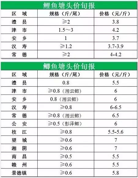 据各个市场统计本周鱼价行情与上周统计日上周相比草鱼、青鱼、鳊鱼、鲫鱼部分地区有所上涨,其他地区均没什么太大变化,行情稳定,详细报价如下: