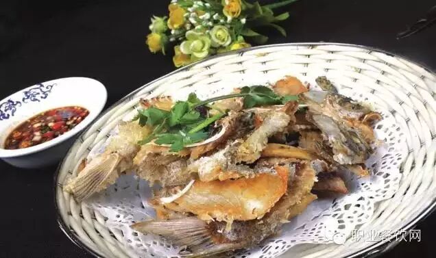 取蒸好的武昌鱼一条拍上生粉,入七成热油浸炸2分钟,捞出沥油,撕成大块,纳入盘中,点缀香菜段5克,带自制料汁走菜即可。