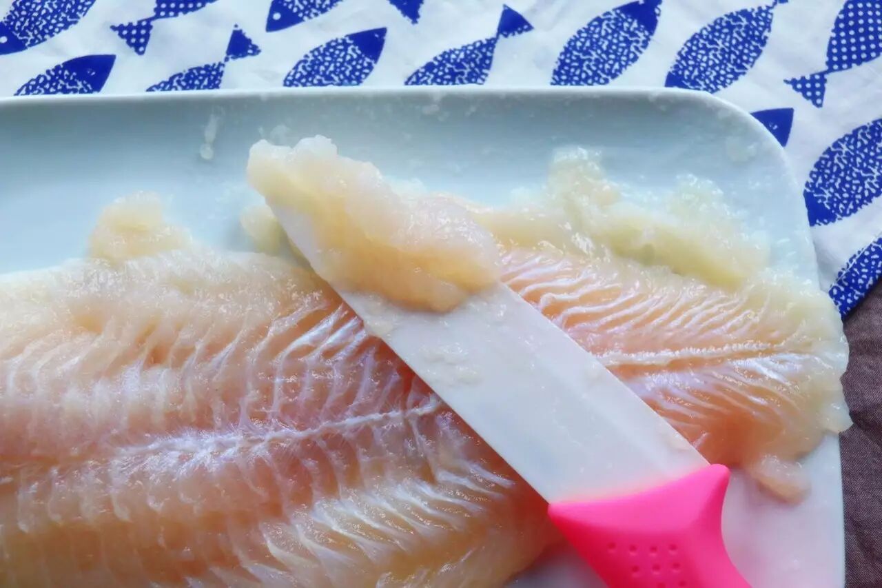 步骤 1:用刀刮出鱼茸,这样能把鱼筋去掉。
