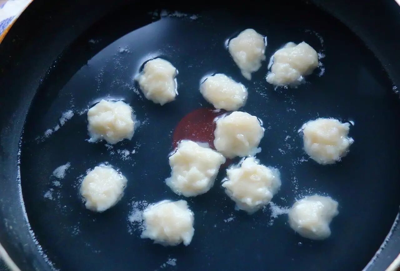 步骤 5:锅里烧开水,开始做鱼丸啦,宝妈们可以用手握拳,用虎口处挤出鱼丸,也可以用小勺舀一勺鱼茸团成小丸子,然后依次放进锅里煮。